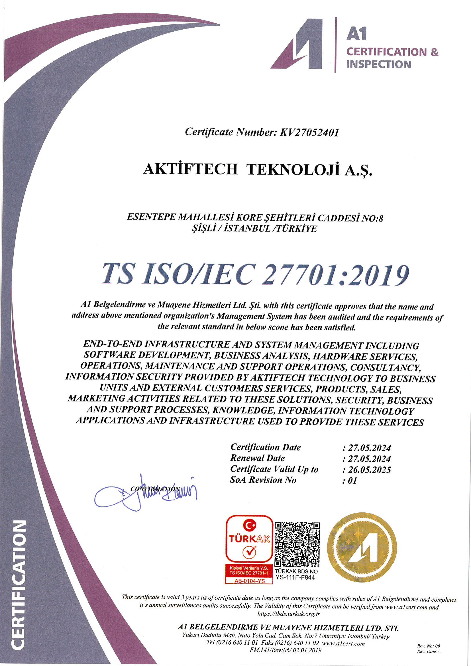 AKTIFTECH TEKNOLOJI A.S. TS EN ISO 27001:2013 TS EN ISO 22301:2019 ISO 20000-1:2018 ISO/IEC 27017:2021 TS ISO/IEC 27701:2019 AKTİF YATIRIM BANKASI A.S. TS EN ISO 27001:2013 TS EN ISO 22301:2019 ISO 20000-1:2018